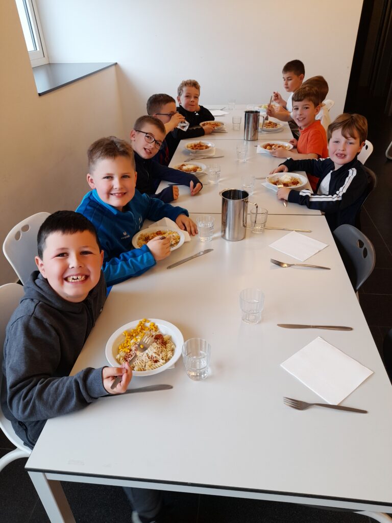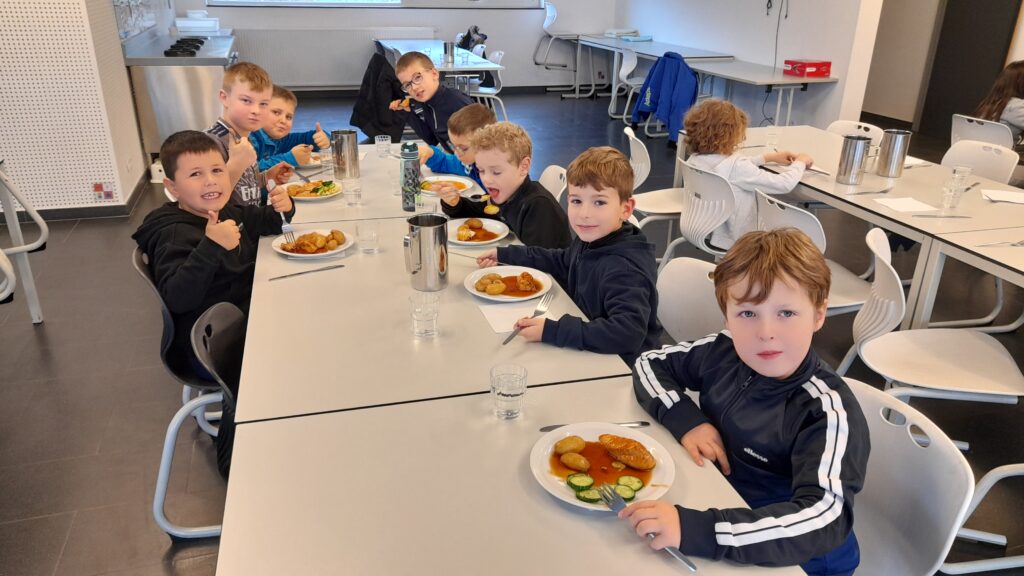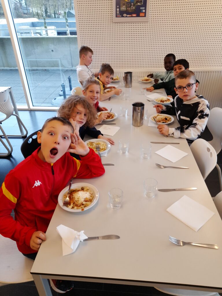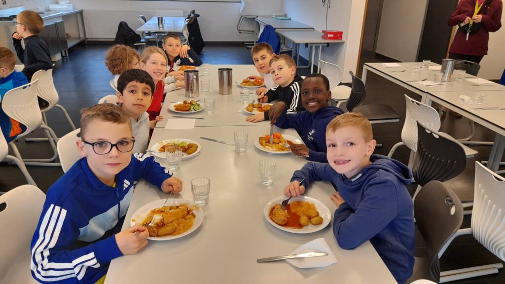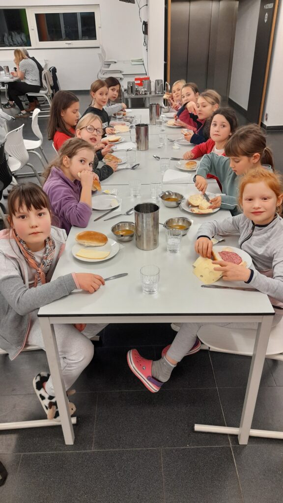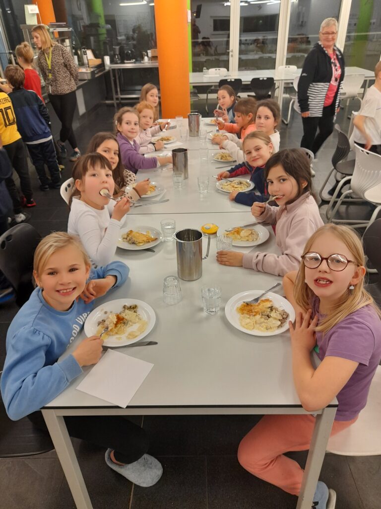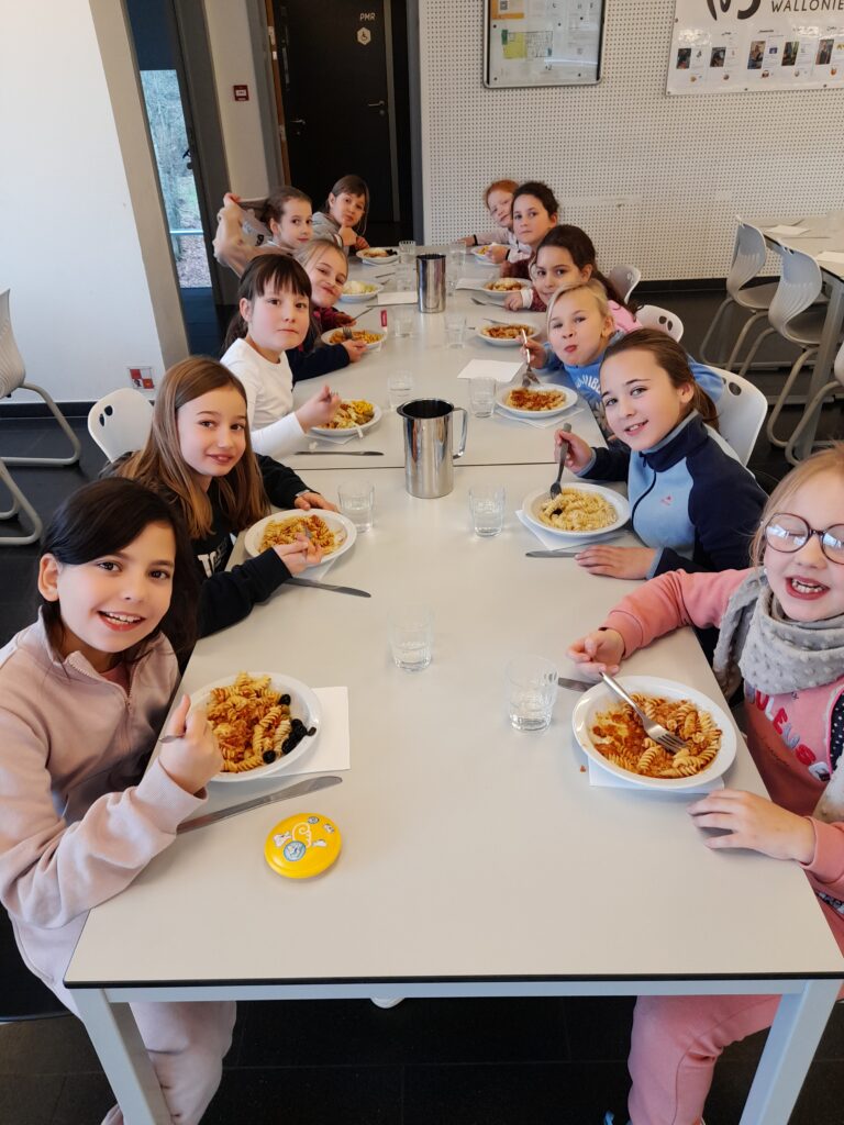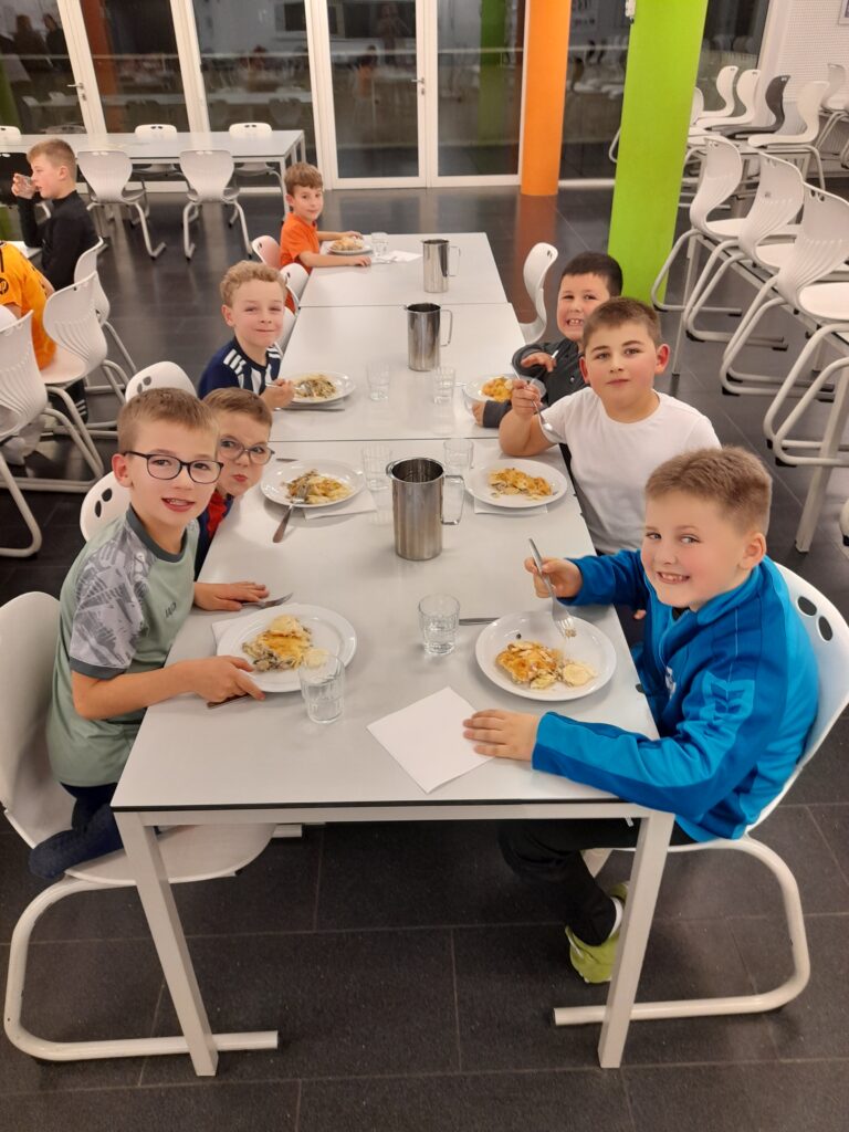 La journée sportive se termine. Après quelques courses relais, nous passons au réfectoire. Au menu du soir : hachis parmentier et fruit.